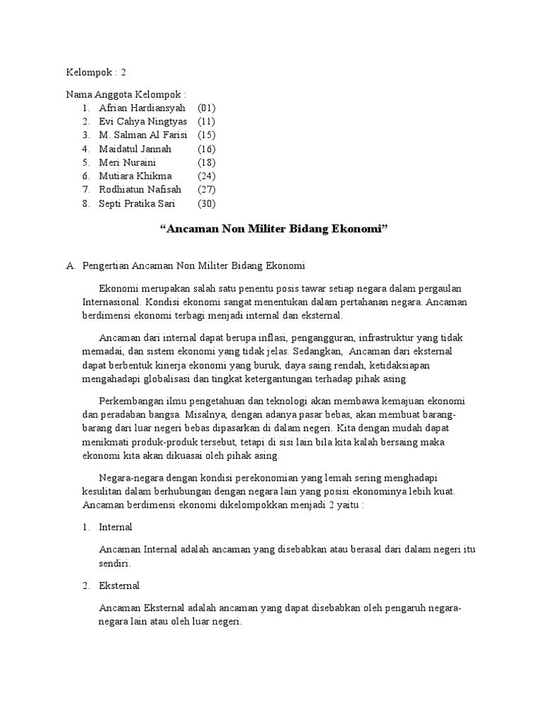 Ancaman non militer bidang ekonomi. Terhadap negara atau korporasi melalui. Faktor eksternal memberikan peluang terhadap ancaman ekonomi. Karena hal tersebut semua pihak terutama dari pemerintah dan.