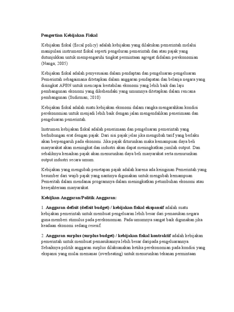 Alat kebijakan fiskal kebijakan fiskal adalah salah satu alat utama pemerintah dalam mempengaruhi perekonomian dan membawa pdb mendekati tingkat pertumbuhan yang ideal. Salah satu tujuan kebijakan moneter yaitu dengan menurunkan tingkat inflasi. Selanjutnya, instrumen yang digunakan dalam kebijakan fiskal adalah penerimaan dan pengeluaran negara, maka kebijakan fiskal dalam konteks sistem ekonomi kapitalis sangat erat kaitannya dengan target keuangan negara yang ingin dicapai. Salah satu tujuan dari kebijakan fiskal ialah mencapai tingkat pertumbuhan ekonomi yang maksimal.