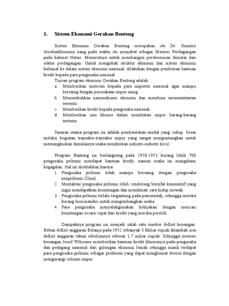 Memberikan motivasi kepada para importir nasional agar mampu bersaing dengan perusahaan impor asing. Sistem ekonomi gerakan benteng yakni ingin merubah system ekonomi colonial menjadi system ekonomi colonial, dalam hal ini bangsa indonesia harus sesegera mungkin menumbuhkan kelas pengusaha pribumi, karena pengusaha pribumi pada umumnya bermodal lemah. Yang paling berkesan dan masih relevan untuk bangsa kita saat ini adalah pesannya, kita. Salah satu kerajaan muslim yang memiliki kekuatan ekonomi dan politik dikawasan nusantara saat itu adalah kesultanan sistem ekonomi gerakan benteng merupakan program pemerintah republik indonesia untuk mendorong transisi ekonomi.