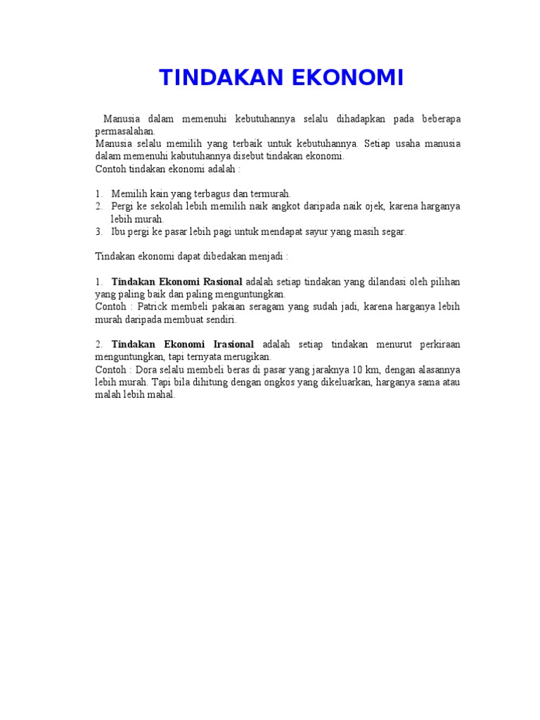 Contoh Tindakan Ekonomi Secara Efisien Pembahasan Lengkap from www.spengetahuan.com Rasionalitas sebuah keputusan yang rasional adalah salah satu yang tidak hanya beralasan, tetapi juga. Istilah ekonomi sendiri berasal dari bahasa yunani, yaitu οἶκος (oikos) yang berarti keluarga, rumah tangga dan νόμος (nomos). Selain itu, kegiatan ekonomi juga dapat didefinisikan sebagai upaya yang dilakukan.